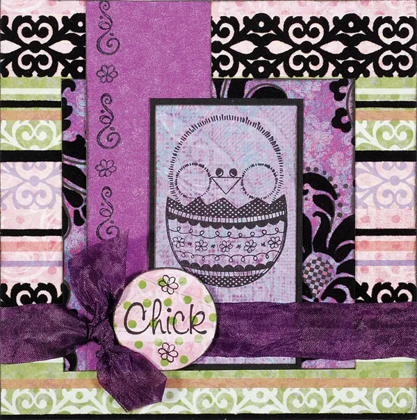 Cut 1 5/8"x2 7/8" moments flocked paper from the unflocked area and stamp the chick positioned near the top. Mat on black cardstock with 1/32" borders and glue to the front as shown. Wrap ribbon around the front, knotting it near the left side. Glue the constructed front securely. Stamp “chick” on an unflocked section of moments flocked paper with two flowers as shown. Ink the edge and foam tape over the ribbon next to the knot.