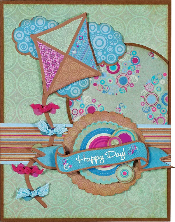 Cut 5"x1" Confetti brown striped paper, ink the edges, and mat the long edges on blue cardstock with 1/16" borders. Glue to the card, 1 5/8" from the bottom. Follow the package instructions to assemble the papier tole kite and “happy day” pieces, using foam tape between the layers and omitting the bows on the kite’s tail. Glue the pieces to the card as shown. Cut two 3" pink rickrack lengths and two 3" lengths of ¼" wide blue ribbon. Tie a knot in each, trim the ends, then glue to the kite tail as shown.