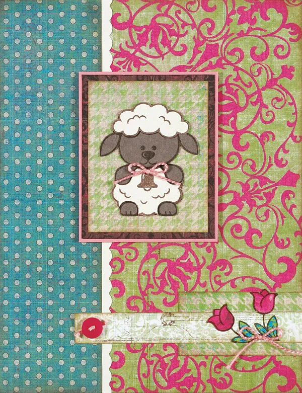 Cut 2"x2½" Boutique houndstooth paper, ink the edges, then mat on Boutique brown paper with 1/8" borders. Mat on pink cardstock with 1/32" borders. Stamp the lamb on gray and ivory cardstock. Cut out the entire lamb from gray. Cut the woolly parts from ivory and glue to the gray lamb, aligning the edges. Glue the lamb to the houndstooth center, then foam tape to the front as shown.