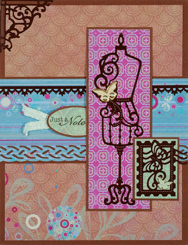 Punch an oval from Confetti green circles paper and stamp “just a note” near the left end. Mat on brown cardstock with a 1/16" border. Fold the ribbon in half and glue extending from under the left end. Cut 1 5/8"x4¾" Confetti pink paper and mat on brown cardstock with 1/16" borders. Place the 4½" dress form Dazzle™ on it, then glue to the card with the oval extending from under the edge as shown. Cut 1 1/8"x1 5/8" confetti green paper and mat on brown cardstock with 1/32" borders. Place the small stamp Dazzle on it, then glue to the front as shown. Place the butterfly and corner Dazzles™ as shown.