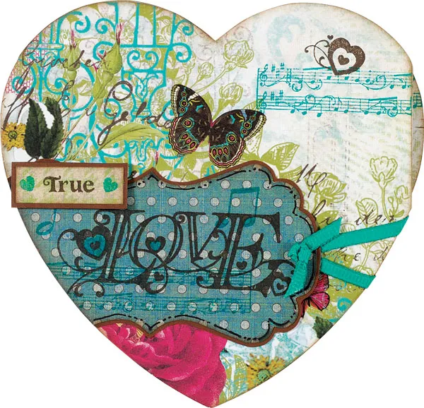 Ink the trimmed label end brown. Stamp “true” in brown on Boutique houndstooth paper with a blue heart on each side. Trim to 1 1/8"x 3/8", ink the edges brown, and mat on brown cardstock with 1/32" borders. Foam tape to the label as shown. Use the paintbrush to lift blue ink and paint the hearts on the label.
