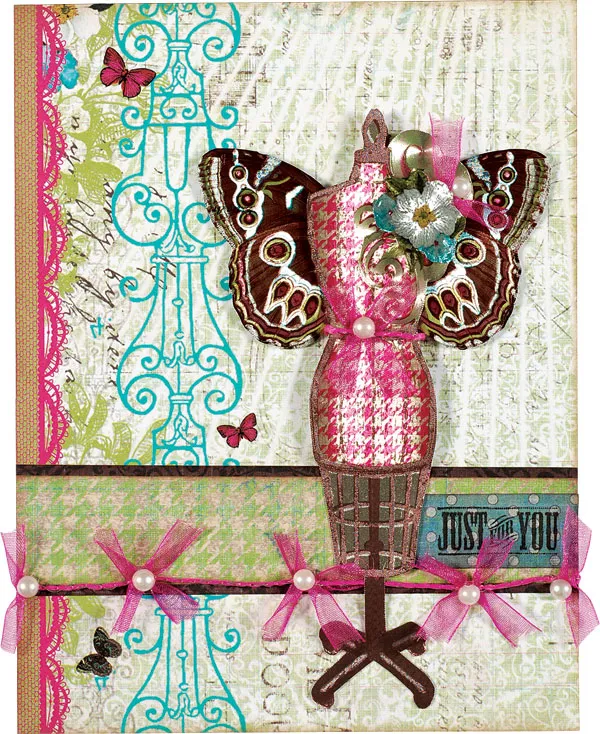 Stamp “just for you” on Boutique blue paper and trim to 1½"x 5/8". Ink the edges and glue to the right end of the border. Follow package directions to punch out the dress form papier tole die cuts. Wrap bow ribbon around the waist of #3, gluing the ends on the back. Assemble the layers with foam tape, then glue to the card as shown. Remove a bow from the remaining ribbon and glue one ribbon under the flower on the dress form, then place a pearl above it as shown. Place a pearl on each bow.