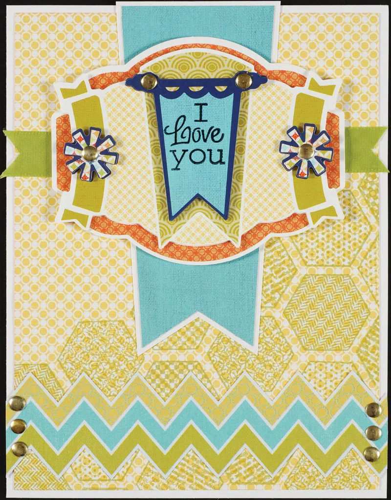 Cut a 5" section of three stripes from the Happy Days chevron paper, trimming along the zigzag edges. Glue across the lower front as shown. Trace the banner pattern and cut from Happy Days blue linen paper. Mat on white cardstock with 1/16" borders, then glue extending down from the center top.