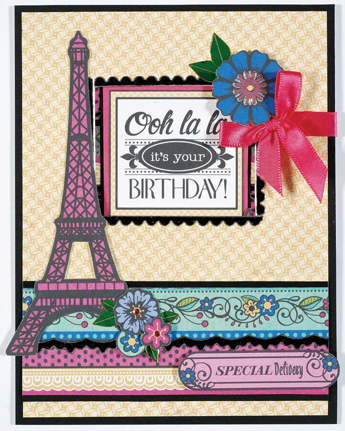 Cut out “Ooh La La it’s your birthday” and mat on pink cardstock with 1/16" borders. Mat on black cardstock with 1/32" borders, then glue centered on the striped paper. Glue the constructed inside so it’s centered in the window when the card is closed. Punch out the die cuts shown and remove the nibs. Glue the die cuts and place the Dazzles™ flowers and leaves as shown.