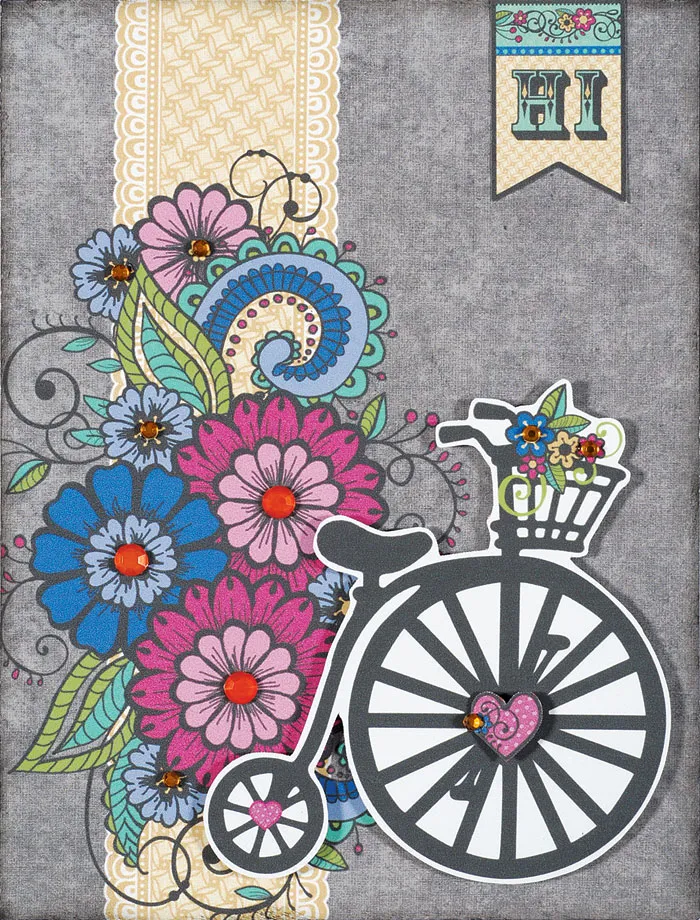 Punch out the bike and ½" heart die cuts and remove the nibs. Foam tape the bike to the lower right corner, then foam tape the heart to the large wheel center. Cut out the “hi” banner and glue to the upper right edge. Place the orange and brown rhinestones as shown.