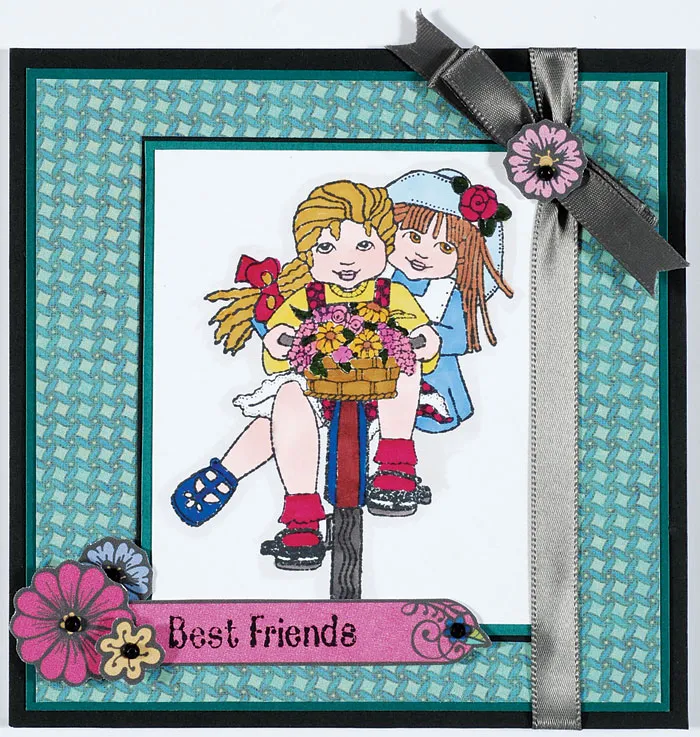 Cut 3"x3½" white cardstock and stamp the biking girls on it. When dry, color the image with the pens. For the girl in front, color her skin FS6, the lips PP3, the hair GB8, and the bow, socks and dress DR For the girl in back, color her skin FS6, the lips PP3, the hair TN7, the coat TB3, the shoes TB9, and the hat TB1 with a DR5 rose.
