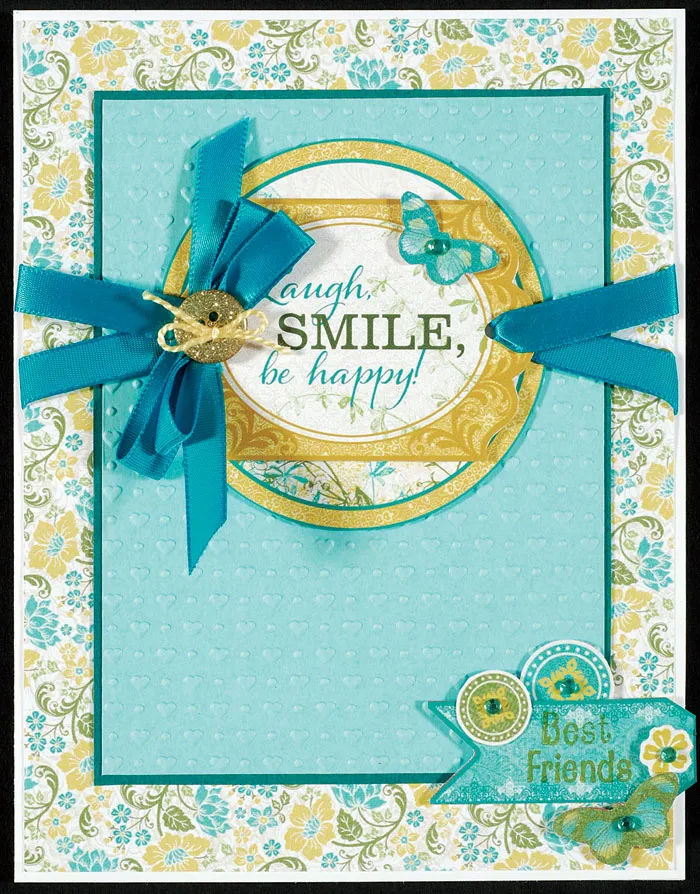 Punch out the 2 7/8" yellow circle die cut and remove the nibs, then glue to the embossed panel, 3/8" from the top. Cut out the “laugh, smile,…” sentiment and punch a hole in each end. Cut two 3½" ribbons and thread one through each hole. Foam tape the greeting to the circle label, then glue the ribbon ends to the back. Glue the constructed front centered on the card.