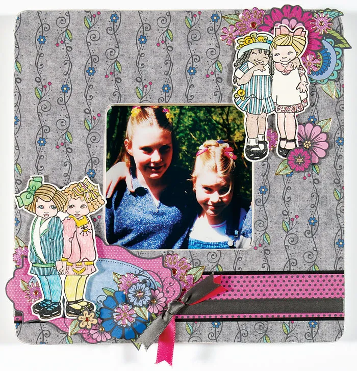 Glue the 2¼" flower cluster die cut to the upper right corner, then glue the 1" pink flower die cut and foam tape the girls as shown. Foam tape the 5/8" flower die cut and place the Dazzles™ flowers and leaves around the girls as shown. Trace the frame insert from step 1 onto the back of your photo, cut out, then insert the photo into the frame and bend the prongs in place.
