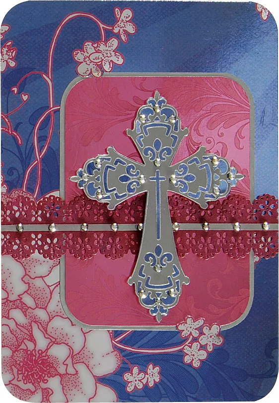 For the inside: Cut a 4” x 5½” piece of the floral corners paper and round the corners. Print the sentiment in purple on white, then mat it on pink and silver, varying the mat widths as shown. Glue it to the floral paper. Adhere a 1½” cross to the purple area of the foil paper and cut it out. Glue it at the top of the sentiment as shown.