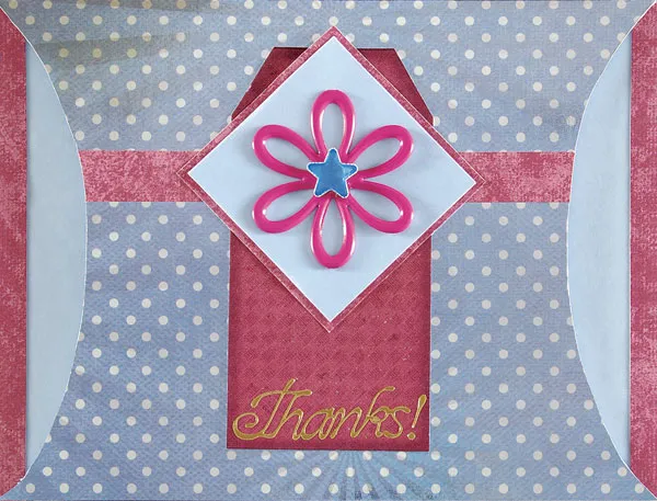 Back a 2" blue vellum square on white cardstock, then mat on pink textured paper. Turn the square on point (like a diamond), and attach the pink super sized flower brad over the center. Cut the prongs from the back of a blue sparkle brad and glue the blue star to the center of the flower brad. Glue centered over the top of the tag. Use the transfer sheet to add the "Thanks!" sticker across the bottom of the tag.