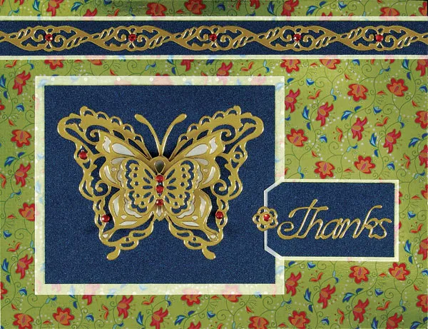 Cut a 6 1/2" x 1/2" lapis glimmer strip and mat on vellum, leaving a thin border. Glue across the card front, 1/4" from the top. Attach the border sticker centered over the glimmer strip, trimming ends evenly. Cut a 2" x 1 1/8" glimmer rectangle and trim the ends to create a tag shape. Mat on vellum and glue overlapping the right edge of the butterfly rectangle. Use the transfer sheet to add "Thanks" to the center of the tag. Add a tiny flower sticker to the end. Add ruby crystal stickers to accent the Dazzle stickers as shown.