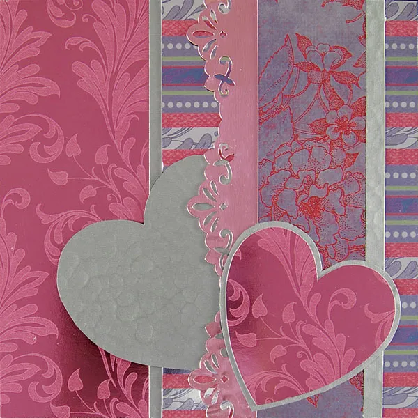 Trace the hearts. Cut a small heart from pink flourishes and mat it on silver. Cut the large heart from silver. Tuck the large heart under the metal border and glue to secure. Glue the pink heart as shown.