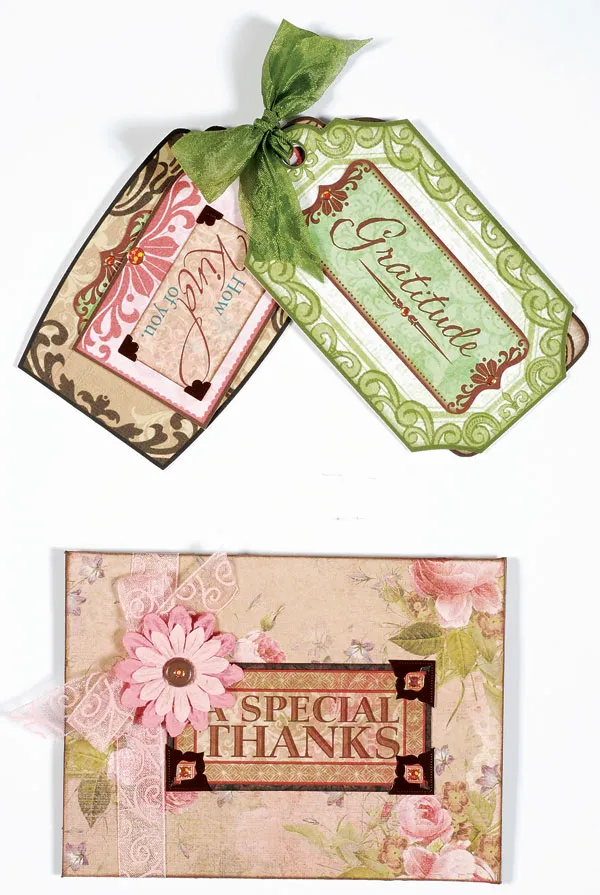 Mat the sentiment from step 2 on Nona’s Garden brown swirls paper with 1/32" borders and glue centered on the envelope front. Stack a 1" light pink flower over a 1½" dark pink flower and secure with a brown brad. Glue to the sentiment at the upper left corner, then place jewel Dazzles™ as shown. Insert the tag book in the envelope. Wrap pink sheer swirls ribbon around the upper flap and tie in a bow on the front just under the flower petals.