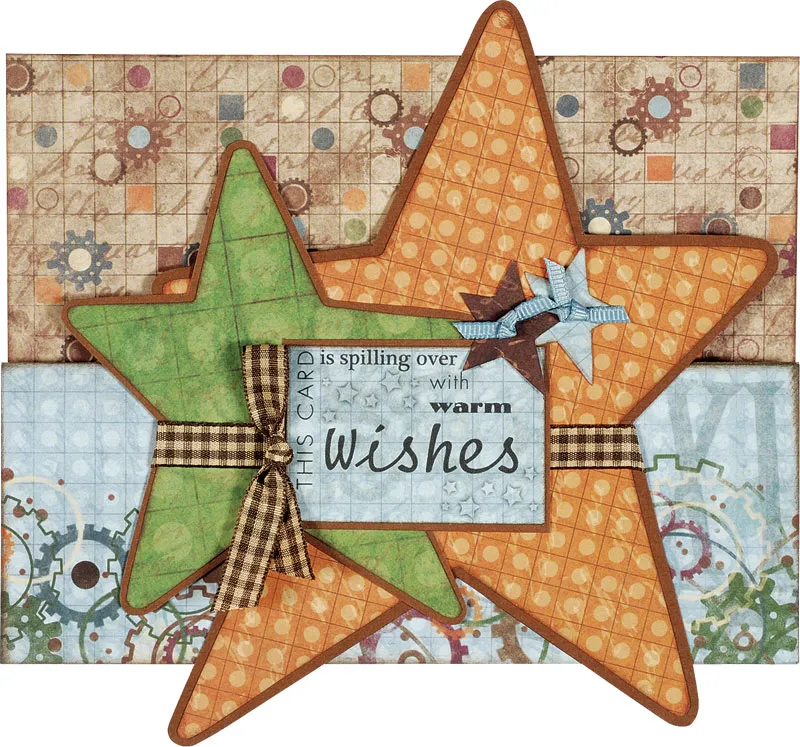 Glue the green star overlapping the orange star, then glue brown gingham ribbon across both, gluing the ends on the back. Glue the stars to the front flap as shown. Copy and size the greeting to 2 1/8" wide. Print on Time For Fun blue checks paper, trim, and ink the edges. Mat on cardstock with 1/32" borders, then glue to the stars.