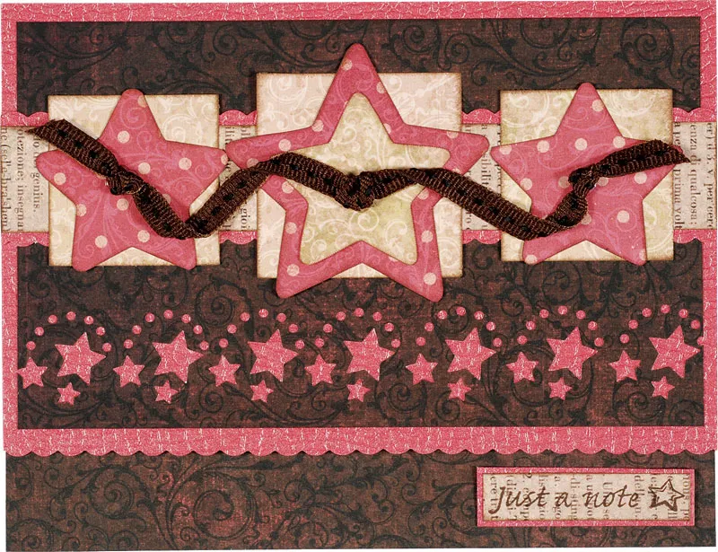 For the inside: Cut Nona’s Garden brown swirls paper to fit the inside, then punch a stars border along the upper long edge. Glue a 6½"x1" cardstock piece behind the stars, then glue the constructed piece to the inside. Stamp “just a note” and a star on Nona’s Garden text paper, trim to 1 7/8"x 3/8" and ink the edges. Mat on cardstock with 1/32" borders, then glue to the lower right.