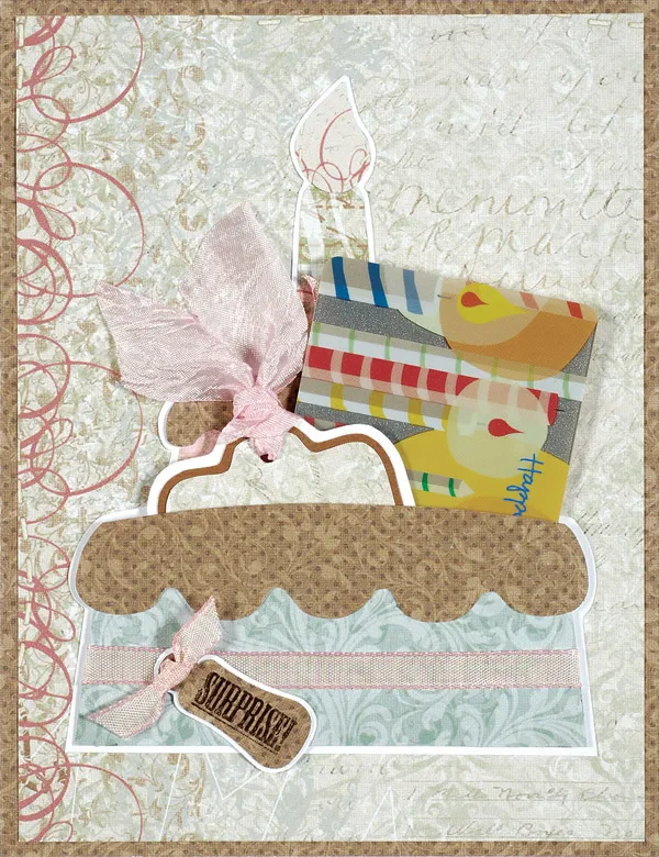 Glue the flame to the candle top, then mat on white cardstock with 1/32" borders. Wrap and tie gingham ribbon around the candle, then glue the candle as shown. Trace and cut the template tag from Handmade Memories tan paper. Cut 2"x¾" Handmade Memories quilt paper and glue to the tag bottom. Trim the excess. Cut a 1/8"x1¾" brown dots paper and glue along the upper edge of the quilt piece. Stamp “birthday wishes” on the tan area, then mat the tag on brown cardstock with 1/32" borders and on white cardstock with 1/16" borders. Punch a hole, tie 3" of pink crepe ribbon to it, and tuck into the pocket. Trace and cut the small tag pattern from brown dots paper. Stamp “surprise” on it, then mat on white cardstock with 1/32" borders. Glue to the ribbon as shown, then glue a knotted 3" gingham ribbon over it and trim the ends.