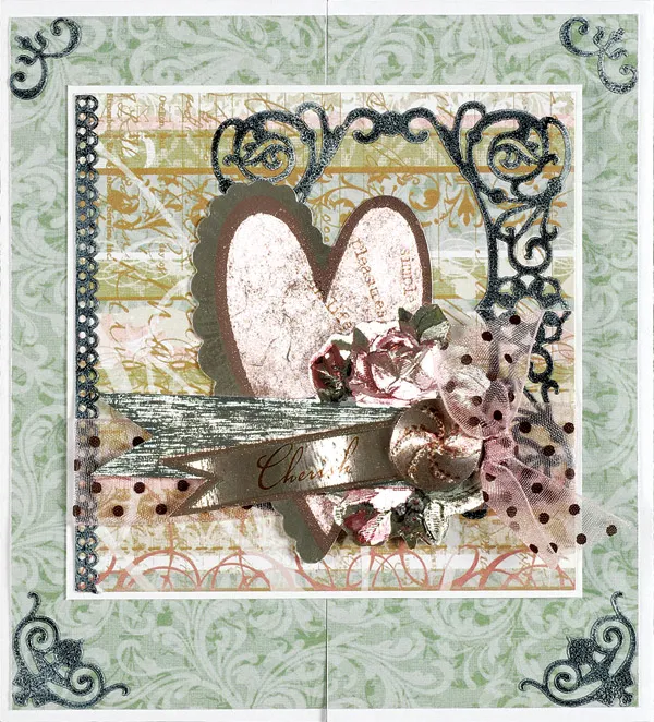 Place the border along the left edge of the striped paper and trim the ends. Place the frame vertically in the upper right corner. Wrap ribbon across the paper, 5/8" from the bottom and glue the ends on the back. Mat on white cardstock with 1/16" borders. Follow package directions to punch and assemble the “Cherish” papier tole piece, using just #2, #3 and #5. Glue to the striped paper, then glue the constructed panel to the left front flap as shown. Knot a 4" ribbon and glue just right of the heart, then place the corner Dazzles™ as shown.