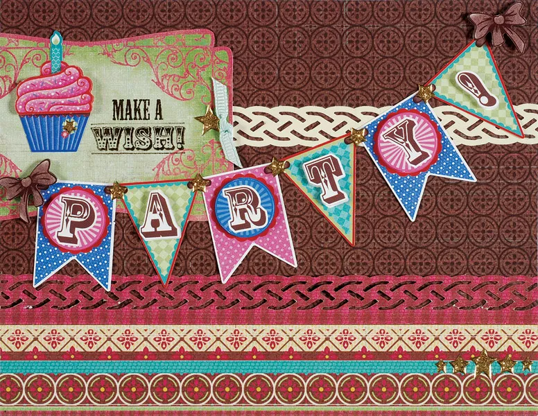 Stamp “make a wish” on the right end of the green/pink label, then trim ¾" off the left end. Glue to the front as shown. Follow the package directions to punch out and assemble the banner papier tole piece. Glue it to the front as shown. Assemble the cupcake extra art and glue to the label near the left edge. Knot a 2" ribbon, trim the ends, and glue to the label right end. Place the Dazzles™ stars as shown.