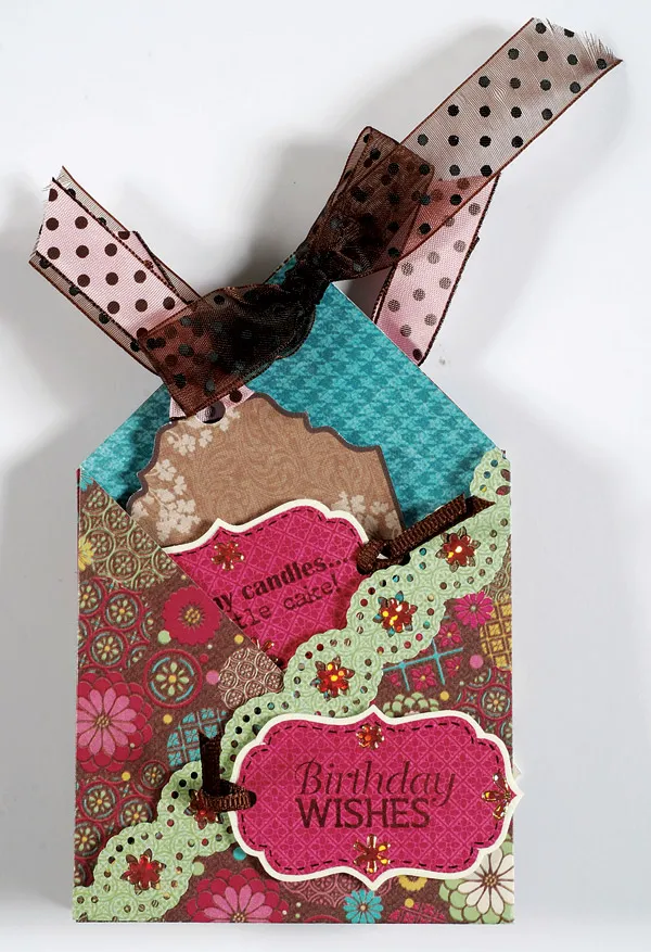 For the large tags: Stamp “the more candles…” on the ivory tag, then tie ½" wide pink/brown dotted ribbon on it. Trace and cut another pink label, then stamp “so many candles…” on it. Draw stitches around the edge, then mat on cardstock with 1/32" borders. Punch a hole in the right end, attach 1/8" brown ribbon, and foam tape to the brown tag. Tie pink/brown ribbon onto the tag. Place the Dazzles on the tags as shown and insert in the pockets.