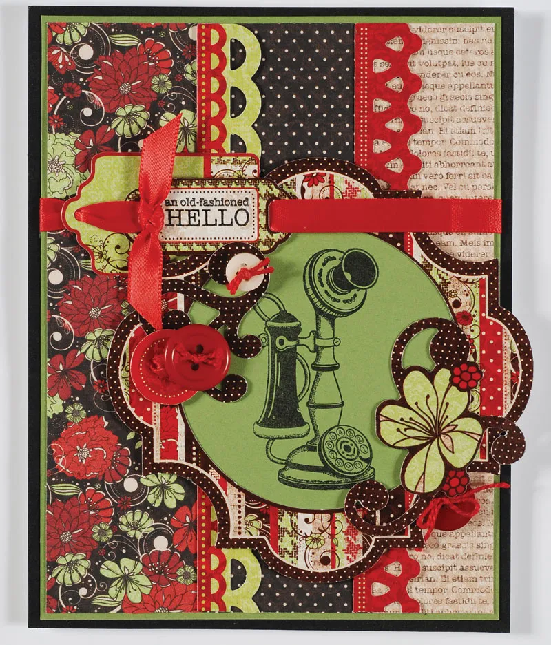 Trace the circle pattern, cut from green cardstock, and stamp the telephone in the center. Punch out the 4 3/8"x4 3/8" frame die cut and remove the nibs. Glue the green circle centered behind the frame, then foam tape the frame to the front, slipping it under the label and ribbon. Adhere the label’s foam tape in place.