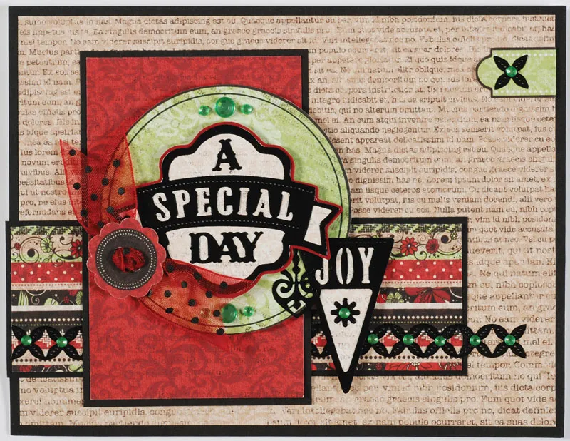 Place the Dazzles™ “a special day” label on Red Velvet border paper and cut out. Mat on red cardstock with 1/32" borders, then foam tape to the circle center. Thread the ribbon onto the button, then foam tape it overlapping the label as shown. Place a Dazzles™ decoration on the green label, then place the rhinestones as shown.