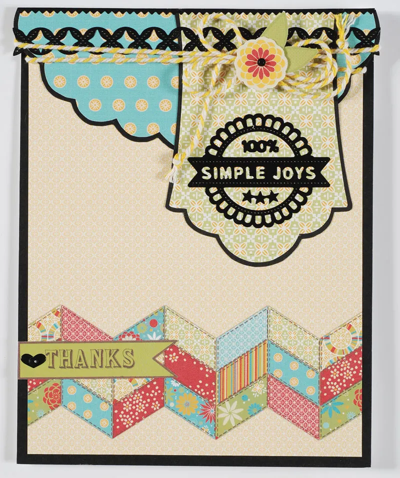 Use thread to tie the twine strands together over the green tag. Make a twine bow with four loops and tie the center with thread. Knot the tails, then use tape to secure to the tag as shown. Place Dazzles™ “simple joys” on the green tag. Punch out a yellow flower and two leaf die cuts and remove the nibs. Tape to the bow center. Cut out the “thanks” greeting and glue to the border, then place the Dazzles™ heart and rhinestones as shown.