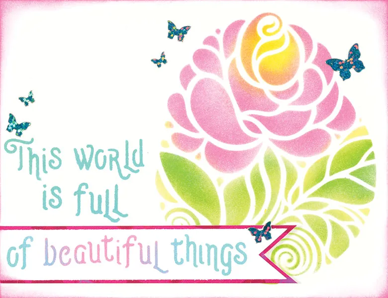 Move the stencil and place “This world” centered on the left, then tape in place and apply teal ink through those words only. Move it again to ink “is full&rdquo,; as shown. Ink “of beautiful things” onto a 7/8” wide strip of white cardstock, using several colors. Cut a “v” in the right end and mat on pink holographic paper with a 1/16” border, then foam tape in place, even with the left edge, as shown. Add butterfly Dazzles™.