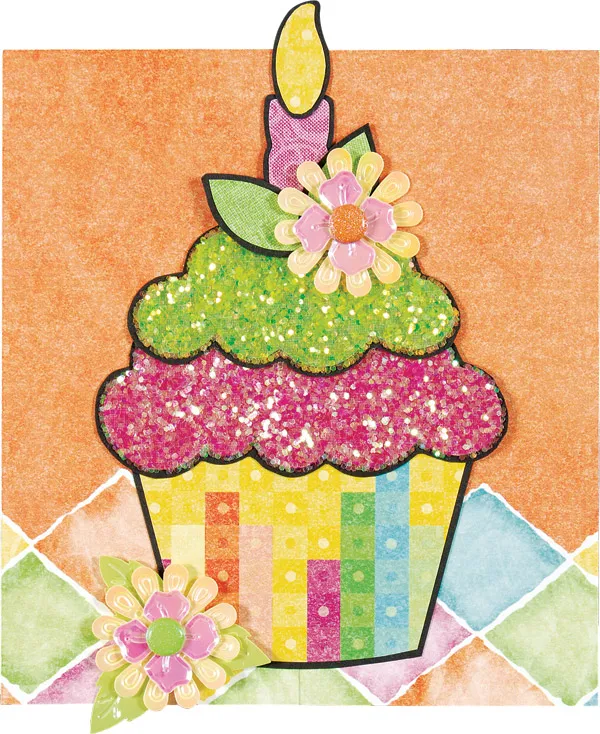 Build the cupcake, gluing the pieces together. Glue the cupcake to the card front, gluing it just to the left flap and letting it overlap the right flap. Glue the leaves at the base of the candle.