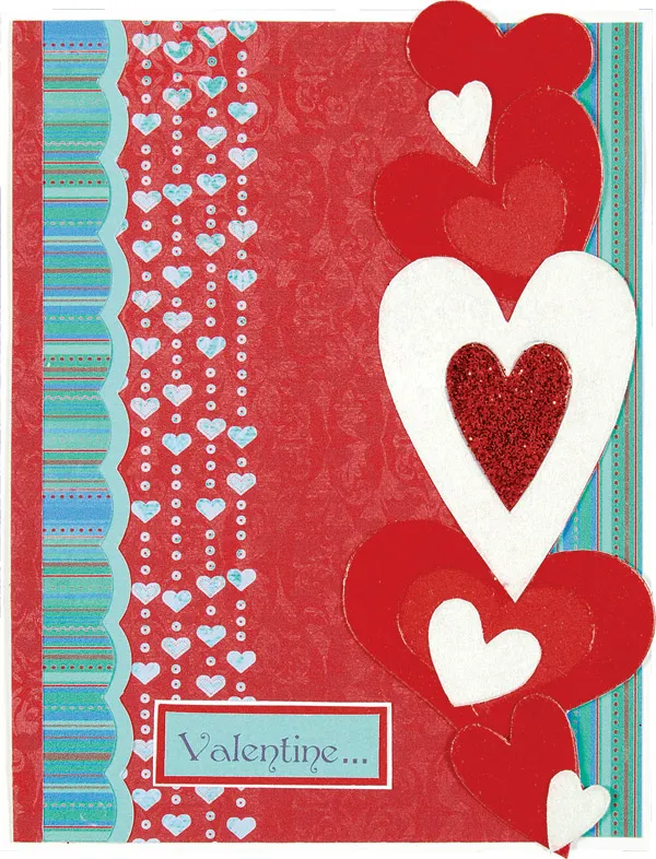 Open the card and place it on a cutting surface. Use the knife to cut the center from the large white heart. Use scissors to cut along the outer edges of all the hearts, creating a cutaway card. Print the greeting in burgundy on light blue. Mat it on red, then on white and glue it to the lower front as shown.