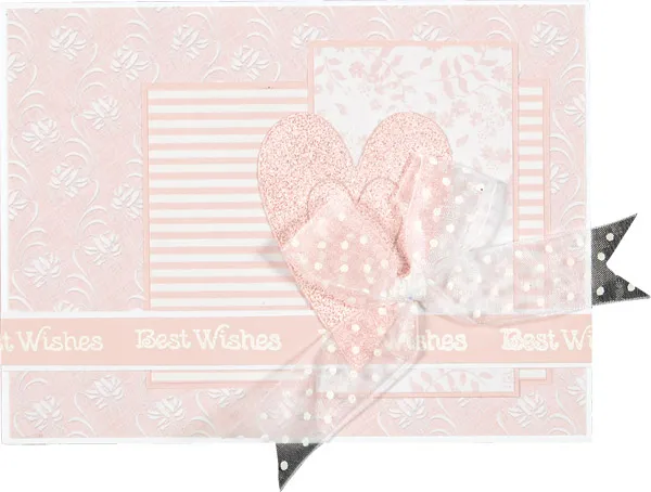 Adhere the largest double heart from the Dazzles sheet to pink paper, keeping the two hearts together. Sprinkle it with the pink embossing powder. (Because the powder has sparkles in it, there’s no need to heat emboss the heart. And the heat could warp and melt the plastic base for the adhesive heart.) Glue the heart over the rectangles and strip as shown. Tie a shoestring bow with the white dotted sheer ribbon and glue it at the left side of the heart.