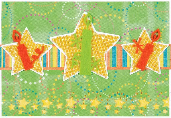 Remove the covering and discard. Sprinkle yellow glitter over all the stars and scrub it into the surface with your fingers to make sure all the adhesive is completely covered. Shake off the excess glitter, then mat each star on white paper. Cut apart a lime and an orange set of felt candles. Cut two orange candles to 1¾” tall and glue one to each small candle. Glue a full-size lime candle to the large star then glue the stars on the striped border as shown.