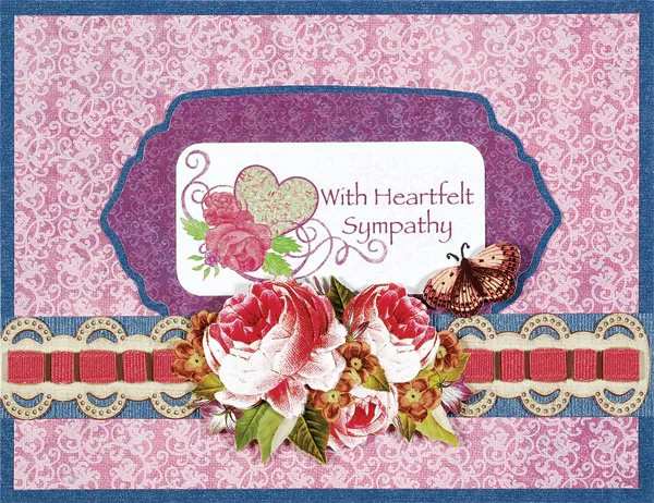 Cut a 6½"x 7/8" cardstock. Punch out the rose border die cuts. Glue #1 to the cardstock strip, then attach #2, and all the ribbon pieces with foam squares. Place #12 on #2, then use foam squares to attach a butterfly to the label. Draw the antennae with the pen.
