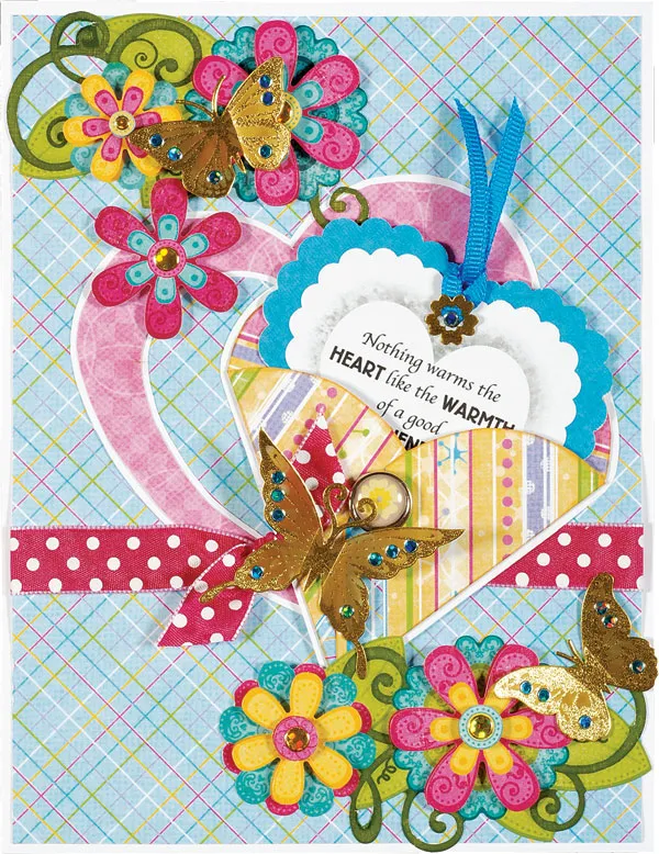Punch out the border die cuts, then cut #1 in two pieces, cutting along the edges of the second and third flowers. Assemble the left end in the upper left corner and the right end in the lower right corner with foam squares between the layers. Punch out #3 from the pink-numbered flower die cuts and attach to the heart with foam squares. Place Dazzles™ butterflies and jewels as shown.