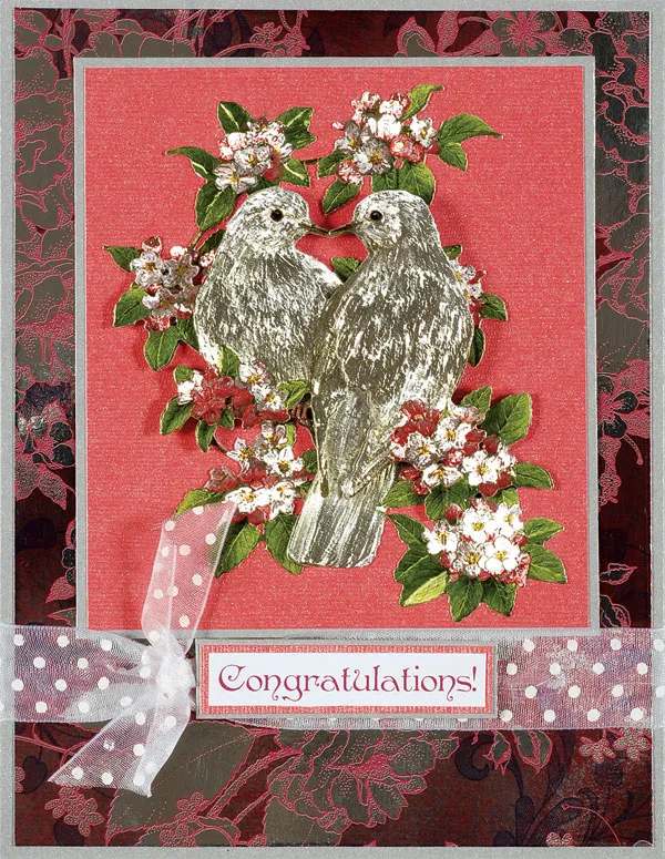 Cut a 3¾"x4¼" pink cardstock and mat on silver cardstock with 1/16" borders. Construct the love birds papier tole design on it, then glue to the card just above the ribbon. Print “congratulations” on white paper and trim to 2"x 3/8". Mat on pink cardstock with 1/16" borders, then on silver cardstock with 1/32" borders. Foam tape to the ribbon center. Knot a 3" ribbon and glue just left of the greeting.