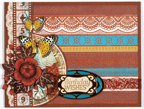 Follow the package instructions to punch out and assemble the filmstrip papier tole piece, placing foam tape between the layers. Mat on brown cardstock with 1/16" borders. Place the 2 1/8" oval Dazzles™ frame on teal cardstock and cut out. Glue it and the papier tole piece to the card and trim off the excess papier tole paper as shown. Stamp “birthday wishes” in brown on tan cardstock, then place the 1 7/8" Dazzles™ frame on it and cut around the edge. Foam tape to the teal label. Knot a 3" ribbon and glue next to the greeting as shown.