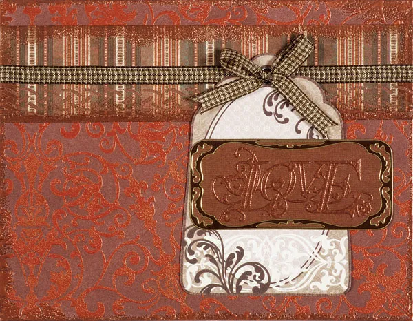 Punch a 7" border in the Heritage striped paper, then trim to 6½"x1 3/8". Mat the punched edge on brown cardstock with a 1/8" border. Ink and emboss the edges. Glue brown gingham ribbon just above the punched border, gluing the ends on the back. Glue the border to the card, 3/8" from the top. Glue the brown tag as shown, then tie and glue a gingham bow at the top. Stamp and emboss “love” on brown cardstock. Place the 3¼" frame Dazzle™ on it, trim the edges, and glue as shown.