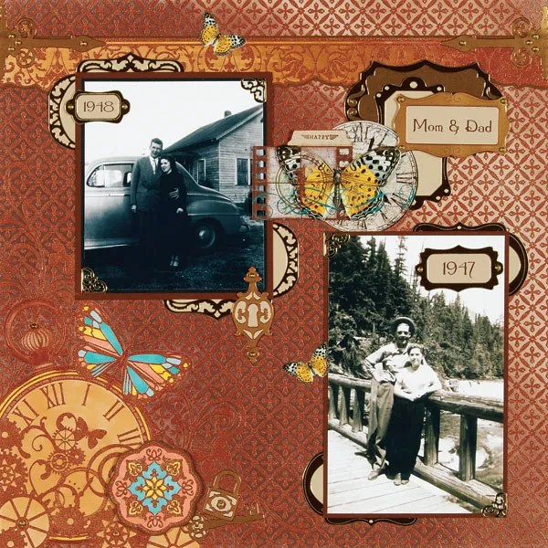 Computer journal to fit the copper Dazzles™ frame, then place the frame on it and cut around the edges. Repeat for the two smaller frames that contain the years. Foam tape and glue as shown. Place corner Dazzles™ on the photos and glue the extra butterfly art as shown. Place the lock, key, and keyhole Dazzles™ on tan paper, cut around the edges, and glue as shown. Place the hinge Dazzles™ on the border ends, then place the pearls as shown.
