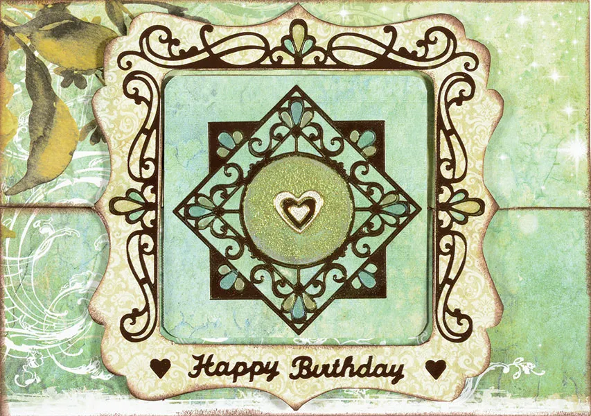 Card Inside: Ink the edges of a 6¼”x4¼” Floral Fantasy turquoise marble paper, and glue centered. Trace a rounded square on Floral Fantasy beige paper, and glue centered. Place the Dazzles™ as shown. Cut apart the last brown frame swirl, and place on either side of the square. Make paint with the Kiwi, and Glacier Lake Mica Powders, to paint the areas shown.