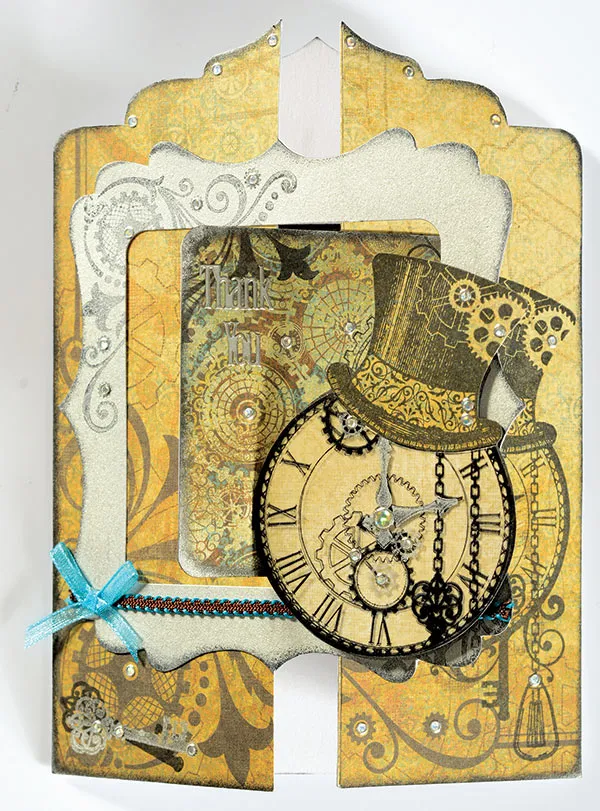 Using the large clock paper with the gear flourish at the bottom left, cut a 4 5/8”x6 ½” paper from the bottom left corner, then cut down the center, into two panels. Glue these panels onto the left and right panel of your closed blank interlocking card (the extended frame and center rectangle pieces will not be covered). Place the “Betty” #3 template from the Design Tool Kit centered at the top of your card, trace and cut the top edges of your closed card. Ink the edges black, then ink sparingly with silver. Let dry.
