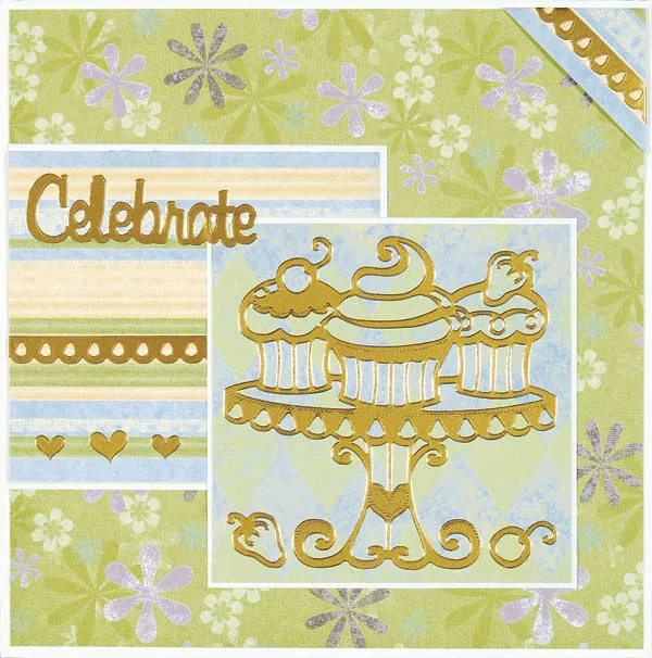 Print the sentiment in purple on the green daisies paper. Adhere a strip of the gold border along the lower edge, then mat the sentiment on white. Glue it centered on the diamond piece. Add a cupcake and a candle near the sentiment as shown.