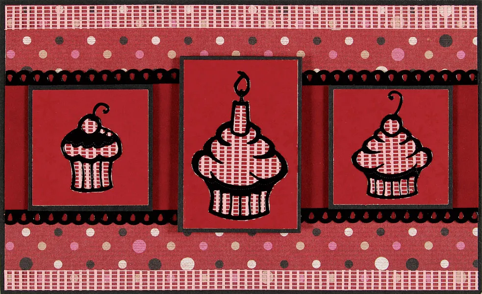 Punch three cupcakes in the splats paper and cut them into 1¼” squares. Mat them on black, then glue them evenly spaced over the stripes. Add two small Dazzles hearts between the cupcakes as shown.