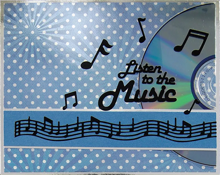 Adhere “Listen to the music” to the card front and CD as shown. Add music notes around it, both on the CD and on the background.