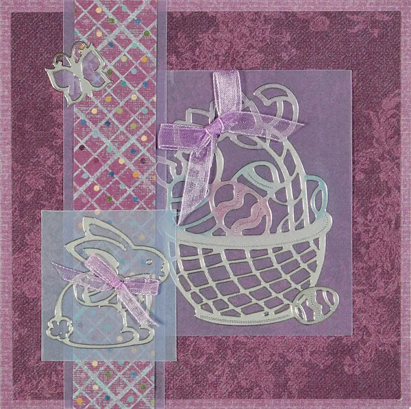 For the inside: Adhere “Happy Easter” to blue vellum, then cut it to 3” x 2½”. Mat it on purple plaid, then on lavender vellum, varying the mat widths as shown. Glue it centered on the inside back, then adhere a small basket and a 1” egg as shown.