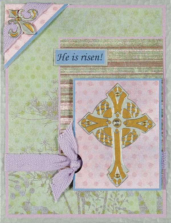 Use foam tape to adhere the cross to the card. Knot a 3” piece of twill and trim the ends. Glue it positioned in the cut out half-circle. Glue the fleur-de-lis to the twill on the corner piece. Add gold pearls to the cross and the fleur-de-lis. Print “He is risen!” in black on blue, cut it out, and mat it on lavender. Glue it to the front as shown.