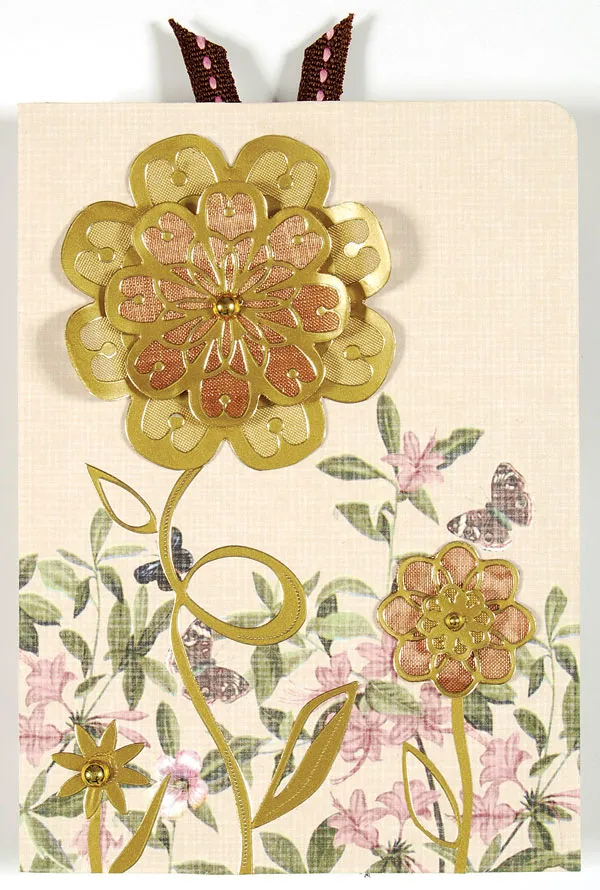 For the folder front: Cut a piece of the butterfly border paper to fit the front of the folder. Adhere a 2½” daisy to gold mesh and a 1¾” daisy to copper. Cut them out then layer the copper over the gold with foam tape. Glue the daisies to the front piece near the upper left. Add one of the loopy stems below it.