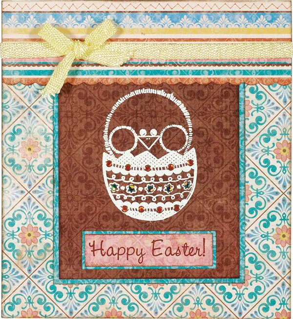 Cut a 4½"x1 3/8" Nostalgia stripes paper, then scallop one long edge. Ink the edges brown and glue a 6" ribbon across it, gluing the ends on the back. Glue to the card top. Tie a shoestring bow and glue as shown. Print “Happy Easter” on Nostalgia coral tiles paper and trim to 2"x½". Ink the edges brown and mat on Nostalgia blue tiles paper with 1/32" borders. Ink the edges brown and glue below the chick as shown. Place Dazzles™ on the egg as shown.