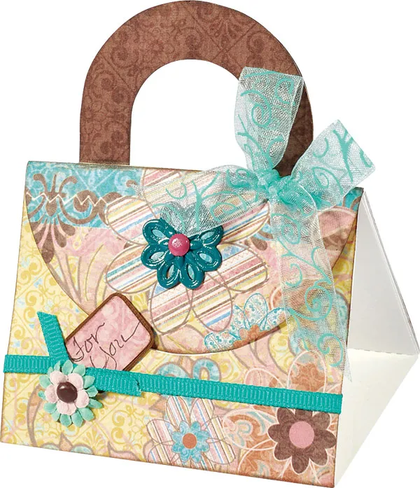Trace and cut two handles from Nostalgia brown tiles paper. Ink the edges and glue one to each side of the handle. Trace the purse flap from the border section of Nostalgia yellow dotted paper, centering a flower on it. Attach a blue Brad Buddy™ to the flower center. Ink the edges and glue to the flap. Tie a shoestring bow with turquoise swirls sheer ribbon and glue to the flap below the handle as shown.
