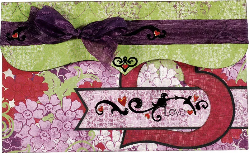 For the front: Cover the front with Bountiful hydrangeas paper and ink the edges. Trace a C2 heart with the C3 heart inside it onto Bountiful red tapestry paper. Cut out the open heart and ink the edges. Mat the outer edges on black cardstock with 1/16" borders. Cut a 4½"x1" Bountiful pink tapestry paper, trimming the left end in a “V”. Ink the edges and mat on black cardstock with 1/16" borders. Slip the right end through the open heart, then glue the banner and heart to the front as shown. On the banner, stamp “love” and place Dazzles™ as shown.