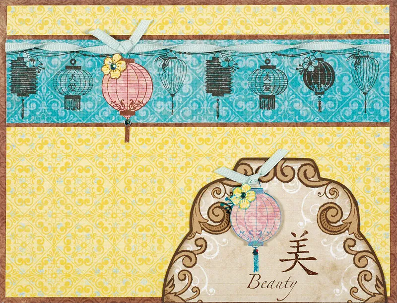 Stamp the single lantern in brown and in blue on Nostalgia coral tiles paper and cut out. Glue the brown lantern to the blue strip as shown, then glue a knotted 2" ribbon above it. Stamp the lantern flower in brown on Nostalgia yellow dotted paper, cut out, and glue to the lantern.