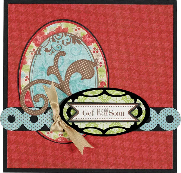 Punch out the Chocolate-Dipped brown swirl die-cut and glue as shown. Place the 2 5/8"x1 3/8" Dazzles™ frame on Chocolate-Dipped green paper and cut around the edge. Glue to the border, just right of the ribbon. Cut out the Chocolate-Dipped “get well soon” greeting and mat on cardstock with 1/32" borders, then foam tape to the frame.